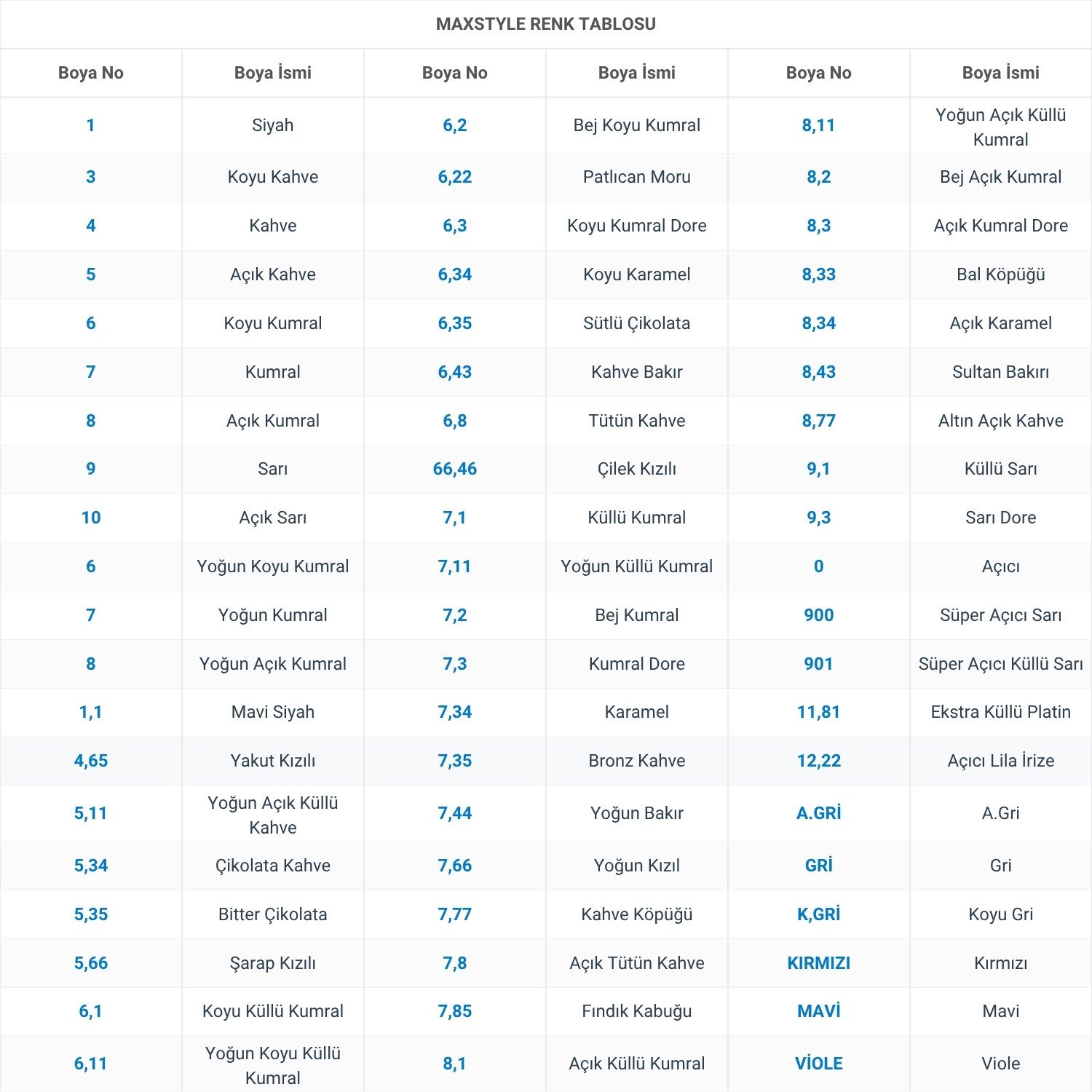 Renk tablosundan hangi renk kodundan kaç adet istendiği ve üründe oksidan var ise 20/30 oksidan seçimi hangi adetlerde olacağı bildirilmelidir.